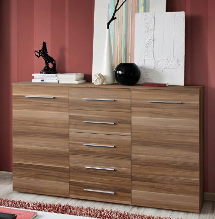 Komoda Fox je vyrobena jako doplněk do obývacích pokojů, ložnic či pracoven. Je třídílná, přičemž po stranách je úložný prostor se dvěma policemi, který je uzavřen dvířky. Ve středu se nachází pět zásuvek. Celkový design podtrhují elegantní podlouhlé úchyty. Vrchní část komody může sloužit jako odkládací prostor na dekorační předměty. Díky množství barevných provedení je možné ji snadno kombinovat s ostatním nábytkem v místnosti.