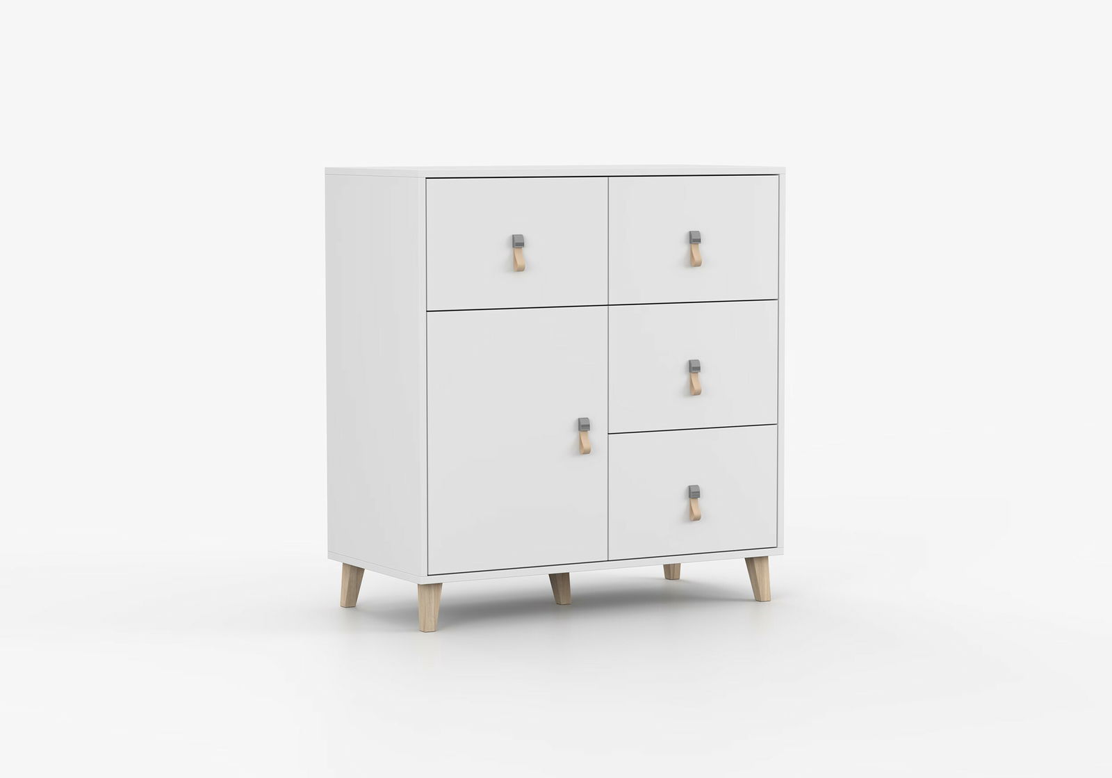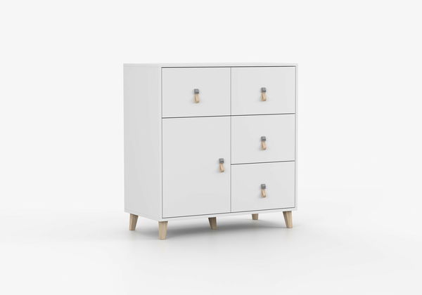 Komoda - Figu (bílá) o výšce 96 cm, šířce 90 cm a hloubce 45 cm je elegantním a praktickým kusem nábytku ve skandinávském stylu. Tato komoda je vyrobena z 16 mm silné dřevotřísky, která poskytuje pevnost a odolnost. Okraje jsou doplněny 0,5 mm silnými ABS hranami, což zvyšuje její kvalitu a estetický vzhled. Komoda má čtyři zásuvky s kuličkovým vedením pro hladké a tiché otevírání a zavírání, jakož i jedny dveře pro další úložný prostor. Úchyty jsou vyrobeny z kůže a mají tvar poutka, což přidává přitažlivý a originální vzhled. Komoda je vybavena dřevěnými nožičkami o výšce 14 cm, které zajišťují stabilní podporu a usnadňují čištění prostoru pod ní. Tato komoda je ideálním řešením pro stylové uspořádání a skladování různých předmětů od oděvů po domácí potřeby. S jejím minimalistickým skandinávským designem a funkčností je vhodná pro jakýkoli moderní domov.