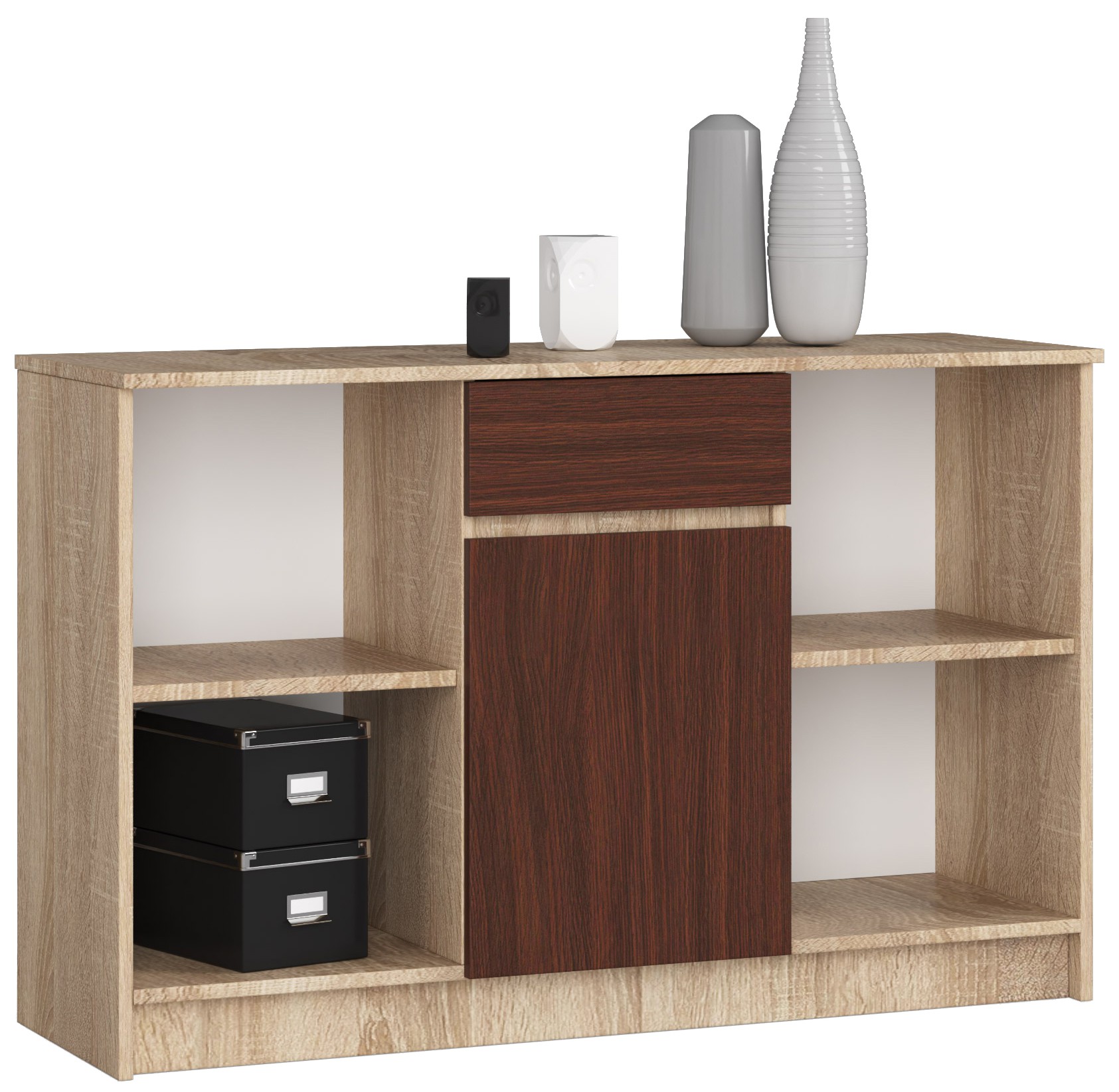 Komoda Fishburn F4 je moderní a elegantní nábytek, který vám poskytne dostatek úložného prostoru pro vaše věci. S výškou 75 cm a hloubkou 42 cm, má dostatečnou kapacitu pro uskladnění vašich oblíbených věcí. Jeho třídílné uspořádání poskytuje rovnoměrné rozdělení prostoru, se třemi zásuvkami uprostřed a skříňkami po stranách. Každá z nich má uvnitř jednu poličku, což vám umožní organizačně uspořádat věci podle vašich potřeb. Komoda je vyrobena z kvalitního dubového dřeva v odstínu sonoma s lesklými grafitovými detaily, které přidávají nábytku stylový a moderní vzhled. Jeho pevná konstrukce a kvalitní materiály zaručují dlouhou životnost a spokojenost s vaším nákupem. Komoda Fishburn F4 je perfektním doplňkem pro váš interiér, který zároveň poskytne praktická řešení pro vaše úložné potřeby.