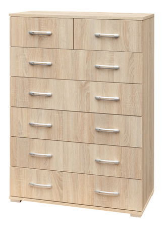Vysoká komoda nabízí mnoho úložného prostoru v pěti velkých a dvou malých zásuvkách. Umístit si ji můžete do předsíně, ložnice či dětského nebo studentského pokoje. Na výběr máte ze dvou barevných provedení: bílá a dub sonoma.