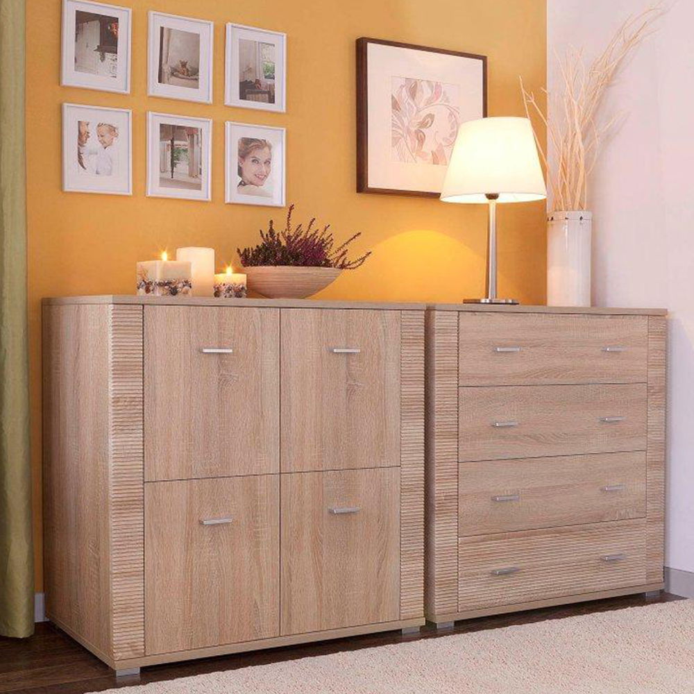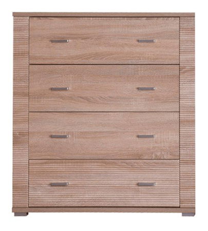 Komoda Gary Typ 11 4S vysoká 96 cm hluboká 39 cm Dub Sonoma je komoda se 4 stejnými zásuvkami umístěnými nad sebou od sektoru GrandNábytek. Je vyrobena z kvalitní laminované DTD v odstínu světlého Dubu Sonoma s ukončením hran vroubkovanou lištou. Tato komoda se bude skvěle hodit do obývacích pokojů, ložnic a pracoven i do předsíň. Rozměry komody jsou (ŠxVxH) 92,8x94x34 cm a tloušťka materiálu korpusu je 16 mm s vrchní a spodní deskou tloušťky 22 mm. Komoda se dodává v demontu a její barevné provedení je dub sonoma.