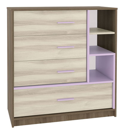 Komoda se čtyřmi zásuvkami a otevřenými policemi. Zásuvky mají vyztužené dno, pro větší nosnost.