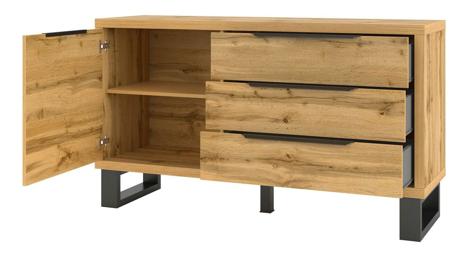 Komoda Harley Typ 47 (dub wotan) je kus nábytku, který okamžitě upoutá vaši pozornost svým drsným a troufalým vzhledem. S výškou 83 cm a hloubkou 45 cm, je rozdělena na dvě části, přičemž první jsou dvířka s policemi a druhé jsou tři zásuvky. Tento produkt ze série Harley stojí na kovových nožičkách, což dodává nábytku elegantní vzhled. Komoda je vyrobena z lamina a kovu a barva jejího povrchu je dub wotan. Tato komoda není jen esteticky příjemná, ale také velmi praktická, díky dostatku úložného prostoru v případě, že potřebujete uskladnit věci. Tato komoda bude skvělým doplňkem do vašeho interiéru a bude dělat dojem na každého, kdo ji uvidí.