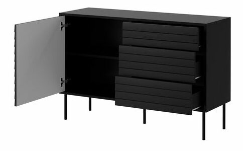 Komoda Hermano 120 1D3S je jedinečný design, který potěší příznivce moderního a loftového stylu. Praktická volba do obývacího pokoje, ložnice a předsíně. Komoda na nožičkách je vybavena inovativním systémem otevírání "PUSH TO OPEN" co to znamená? Pro otevření dvířek nebo zásuvky stačí lehce zatlačit přední část nábytku. Jedná se o moderní a praktické řešení vytvořené s ohledem na vaše pohodlí. Model navíc vypadá elegantněji bez přídavných rukojetí. Naleznete zde velkou skříňku se dvěma policemi, které můžete využít k uložení oblečení, nádobí nebo jiných předmětů. Vedle ní jsou tři prostorné zásuvky. Jsou ideální pro pořádání dokumentů nebo knih.