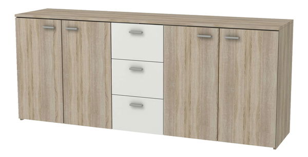 Kombinovaná komoda s dvířky a zásuvkami poskytuje skutečně mnoho odkládacího prostoru o čemž svědčí především šířka 180 cm. Komoda Houston se může stát součástí obývákové stěny ze stejné modelové řady nebo ji lze využít samostatně v šatníku, ložnici nebo v předsíni. Vyrobena je z laminované dřevotřískové desky, která je nenáročná na údržbu a a hrany jsou ošetřeny ABS lištami.