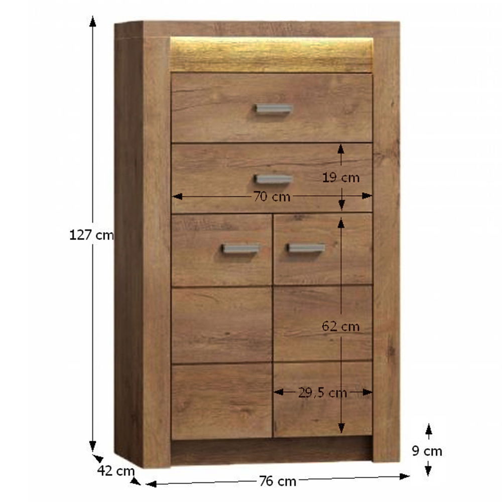 Vysoká komoda ze sektorové sestavy Inneas se skvěle hodí do obývacích pokojů a ložnic. Ve spodní části komody se nacházejí dvě dvířka a ve vrchní části dvě zásuvky. Možnost dokoupení vkusného LED osvětlení, které se instaluje nad vrchní zásuvku.