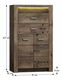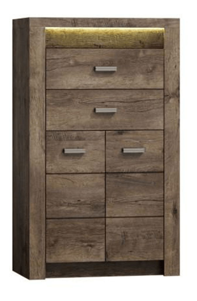 Vysoká komoda ze sektorové sestavy Inneas se skvěle hodí do obývacích pokojů a ložnic. Ve spodní části komody se nacházejí dvě dvířka a ve vrchní části dvě zásuvky. Možnost dokoupení vkusného LED osvětlení, které se instaluje nad vrchní zásuvku.