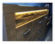 Luxusní sektorový nábytek vysoké kvality v masivním designu s prvky surového malovaného dřeva a výraznou reliéfní kresbou, s efektivním LED podsvícením, vhodný na zařízení obývacích pokojů a jídelen, korpus hrubý až 48 mm, úchyty kovové. Možnost dokoupení LED osvětlení. Materiál: DTD laminovaná, ABS hrany