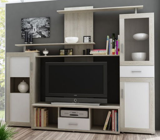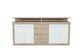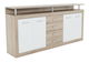 Komoda Jachim - Juno je vyrobena z laminované DTD v barevné kombinaci dřeva dub sonoma s bílou. Úložný prostor je rozdělen na dvě skříňky s dvěma dvířky, čtyři zásuvky a vyvýšenou část pro odkládání dekoračních předmětů. Dvířka komody jsou matné. Doporučuje se kombinovat s obývací stěnou Jachim - Juno.