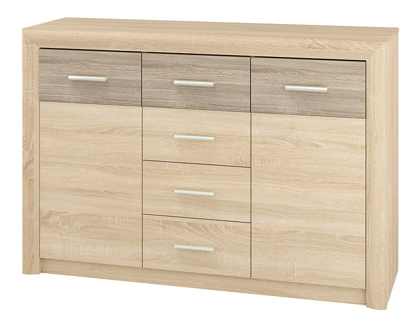 Komoda se třemi poličkami a dvěma dveřmi v barvě sonoma světla + MDF sonoma lanýž přináší svěžest do každého interiéru, takže je určena pro osoby které ocení eleganci, přirozenost a jednoduchost. Desky jsou z lamina nejvyšší kvality. Odolné vůči poškrábání, vlhkosti a vysokým teplotám. Dodává se v demontu.