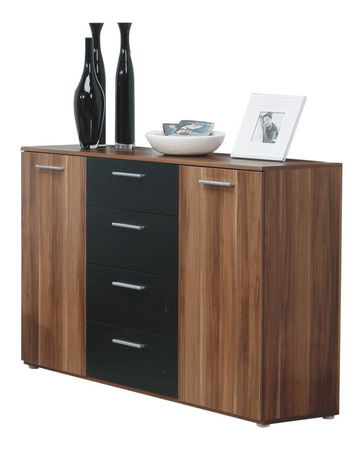 Elegantní komoda Juliet v provedení ořech a černé barvy s minimalistickými šedými úchyty. Komoda má po stranách dvířka, za kterými se nacházejí poličky. Ve středu komody jsou umístěny 4 zásuvky v černé barvě.