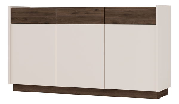 Komoda - Kabal I (béžová + ořech tmavý) je vyrobena z kvalitní laminované desky a HDF. S tloušťkou desky 16 mm a zadní stěnou 2,5 mm je pevná a odolná. Nabízí 3 dvířka a 3 zásuvky se systémem otevírání Push-to-open pro moderní a pohodlný přístup k úložnému prostoru.