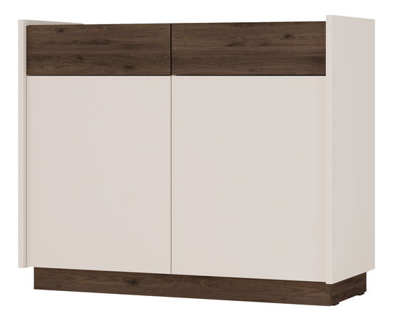 Komoda - Kabal II (béžová + ořech tmavý) je vyrobena z kvalitní laminované desky a HDF. S tloušťkou desky 16 mm a zadní stěnou 2,5 mm je pevná a odolná. Nabízí 3 dvířka a 3 zásuvky se systémem otevírání Push-to-open pro moderní a pohodlný přístup k úložnému prostoru.