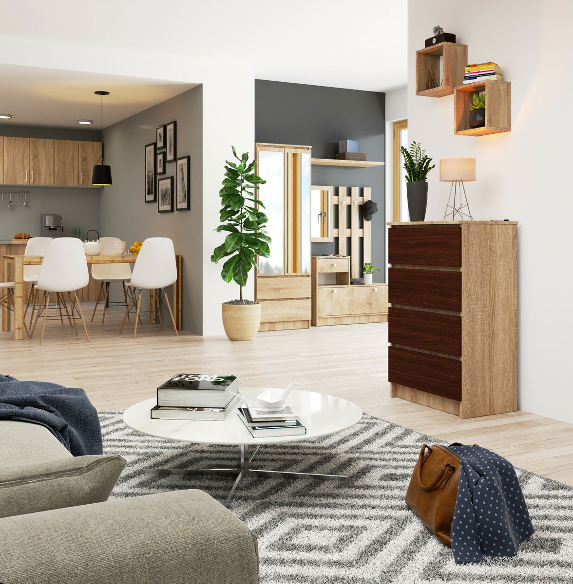 ZobrazitVysoká komoda Kadir Typ 2 je zajímavým návrhem, který najde využití v obýváku i v kanceláři. Funkční kus nábytku tvoří čtyři zásuvky vyrobené z laminované desky o tloušťce 16 milimetrů. Materiál je vysoce odolný vůči oděru, což ovlivňuje životnost a pevnost komody. Za pozornost stojí její moderní design - jednoduchost a elegance i minimalistický styl. Výrobek určený pro svépomocnou montáž vyniká od konkurence mimořádně pečlivým a solidním zpracováním. Komoda je vyrobena z kvalitní laminované desky odolné vůči oděru. Přední zásuvky jsou také vyrobeny z laminované desky. Zásuvky se pohybují na kovových válečkových vodítkách. Hrany pokryté ABS hranou zajišťují vysokou ochranu proti poškození. Dostupná ve více barevných provedeních.