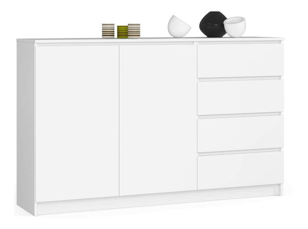 Nadčasová bílá barva komody Kaida se hodí do každého stylu interiéru. Bílá komoda se vyznačuje 4 pohodlně otevíratelnými zásuvkami a 2 velkými policemi. Do komody uložíte všechny potřebné věci a budete je mít vždy na dosah ruky. Skvěle se bude vyjímat v předsíni, obývacím pokoji, hotelovém pokoji nebo moderní kanceláři. Jedná se o univerzální nábytek, který svým uživatelům nabízí řadu výhod. Proto se je do interiéru vyplatí vyjmout. Komoda je vyrobena z kvalitní 16 mm laminované desky odolné vůči oděru. Čela zásuvek jsou vyrobena z laminované desky. Zásuvky se pohybují na kovových válečkových vodítkách. Hrany jsou kryty ABS lemováním a zajišťují tak vysokou ochranu proti poškození. Uvnitř dvířek se nachází jedna police.