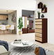 Komoda Kalista III se vyznačuje minimalistickým designem, funkčností, komfortem používání a vysokou estetikou. Je vyrobena z kvalitní laminované desky o tloušťce 16 milimetrů, která je odolná vůči poškození. Je k dispozici v našem internetovém obchodu za mimořádně konkurenční cenu. Korpus komody sestává z matné bílé laminované desky. Čela zásuvek jsou vyrobena z 19 mm MDF vysokého lesku. Zásuvky se pohybují na kovových válečkových vodítkách. Horní část, boky a přední část jsou pokryty ABS lemováním, zajišťují tak vysokou ochranu proti poškození. Dostupná ve více barevných provedeních.