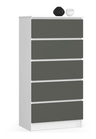 Komoda Kalista V se vyznačuje minimalistickým designem, funkčností, komfortem používání a vysokou estetikou. Je vyrobena z kvalitní laminované desky o tloušťce 16 milimetrů, která je odolná vůči poškození. Je k dispozici v našem internetovém obchodu za mimořádně konkurenční cenu. Korpus komody sestává z matné bílé laminované desky. Čela zásuvek jsou vyrobena z 19 mm MDF vysokého lesku. Disponuje až 5 zásuvkami, které se pohybují na kovových válečkových vodítkách. Hrany jsou pokryty ABS lemováním, zajišťují tak vysokou ochranu proti poškození. Dostupná ve více barevných provedeních.
