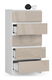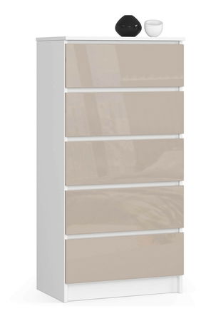 Komoda Kalista V se vyznačuje minimalistickým designem, funkčností, komfortem používání a vysokou estetikou. Je vyrobena z kvalitní laminované desky o tloušťce 16 milimetrů, která je odolná vůči poškození. Je k dispozici v našem internetovém obchodu za mimořádně konkurenční cenu. Korpus komody sestává z matné bílé laminované desky. Čela zásuvek jsou vyrobena z 19 mm MDF vysokého lesku. Disponuje až 5 zásuvkami, které se pohybují na kovových válečkových vodítkách. Hrany jsou pokryty ABS lemováním, zajišťují tak vysokou ochranu proti poškození. Dostupná ve více barevných provedeních.