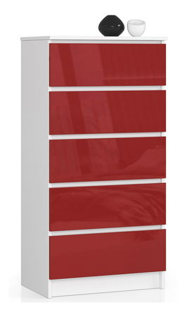 Komoda Kalista V se vyznačuje minimalistickým designem, funkčností, komfortem používání a vysokou estetikou. Je vyrobena z kvalitní laminované desky o tloušťce 16 milimetrů, která je odolná vůči poškození. Je k dispozici v našem internetovém obchodu za mimořádně konkurenční cenu. Korpus komody sestává z matné bílé laminované desky. Čela zásuvek jsou vyrobena z 19 mm MDF vysokého lesku. Disponuje až 5 zásuvkami, které se pohybují na kovových válečkových vodítkách. Hrany jsou pokryty ABS lemováním, zajišťují tak vysokou ochranu proti poškození. Dostupná ve více barevných provedeních.
