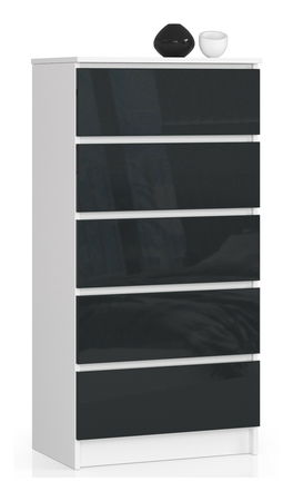 Komoda Kalista V se vyznačuje minimalistickým designem, funkčností, komfortem používání a vysokou estetikou. Je vyrobena z kvalitní laminované desky o tloušťce 16 milimetrů, která je odolná vůči poškození. Je k dispozici v našem internetovém obchodu za mimořádně konkurenční cenu. Korpus komody sestává z matné bílé laminované desky. Čela zásuvek jsou vyrobena z 19 mm MDF vysokého lesku. Disponuje až 5 zásuvkami, které se pohybují na kovových válečkových vodítkách. Hrany jsou pokryty ABS lemováním, zajišťují tak vysokou ochranu proti poškození. Dostupná ve více barevných provedeních.