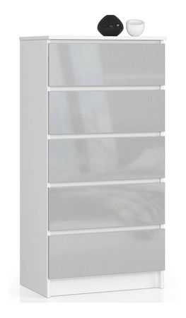 Komoda Kalista V se vyznačuje minimalistickým designem, funkčností, komfortem používání a vysokou estetikou. Je vyrobena z kvalitní laminované desky o tloušťce 16 milimetrů, která je odolná vůči poškození. Je k dispozici v našem internetovém obchodu za mimořádně konkurenční cenu. Korpus komody sestává z matné bílé laminované desky. Čela zásuvek jsou vyrobena z 19 mm MDF vysokého lesku. Disponuje až 5 zásuvkami, které se pohybují na kovových válečkových vodítkách. Hrany jsou pokryty ABS lemováním, zajišťují tak vysokou ochranu proti poškození. Dostupná ve více barevných provedeních.