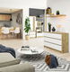 Komoda Kapil je vyrobena z kvalitní laminované desky o tloušťce 16 mm, která je odolná vůči poškození. Dostupná i ve více barevných provedeních. Komoda disponuje až 6 zásuvkami, které se pohybují na kovových válečkových vodítkách. Hrany jsou pokryty ABS lemováním, zajišťují tak vysokou ochranu proti poškození. Dostupná i ve více barevných provedeních.