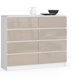 Komoda Kapil II je vyrobena z kvalitní laminované desky o tloušťce 16 mm, která je odolná vůči poškození. Dostupná i ve více barevných provedeních. Komoda disponuje až 8 zásuvkami, které se pohybují na kovových válečkových vodítkách. Hrany jsou pokryty ABS lemováním, zajišťují tak vysokou ochranu proti poškození. Dostupná i ve více barevných provedeních.