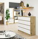 Komoda Kapil II je vyrobena z kvalitní laminované desky o tloušťce 16 mm, která je odolná vůči poškození. Dostupná i ve více barevných provedeních. Komoda disponuje až 8 zásuvkami, které se pohybují na kovových válečkových vodítkách. Hrany jsou pokryty ABS lemováním, zajišťují tak vysokou ochranu proti poškození. Dostupná i ve více barevných provedeních.