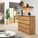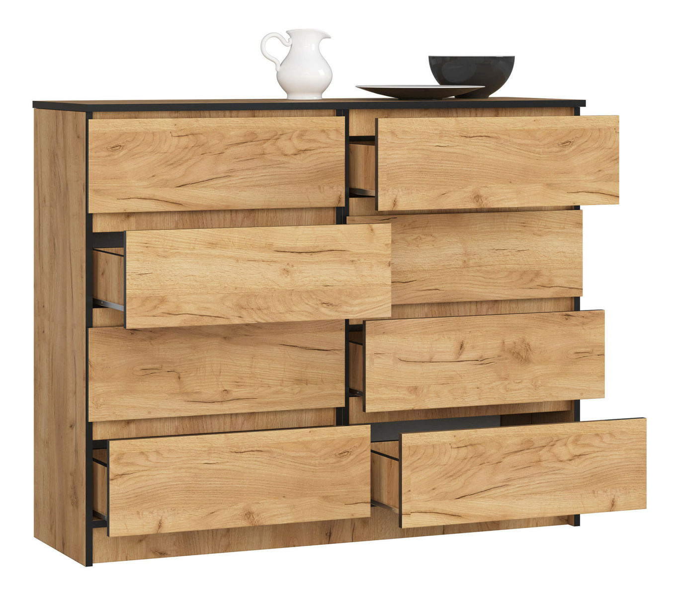 Komoda Kapil II je vyrobena z kvalitní laminované desky o tloušťce 16 mm, která je odolná vůči poškození. Dostupná i ve více barevných provedeních. Komoda disponuje až 8 zásuvkami, které se pohybují na kovových válečkových vodítkách. Hrany jsou pokryty ABS lemováním, zajišťují tak vysokou ochranu proti poškození. Dostupná i ve více barevných provedeních.