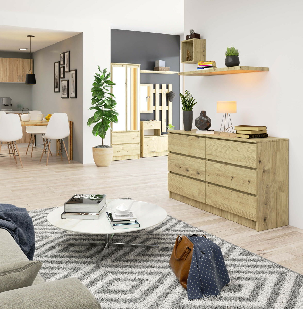 ZobrazitKomody jsou nábytek, který se v poslední době nejčastěji používá v místnostech různých typů – obývacího pokoje, ložnice, kanceláře či jídelny. Komoda Keanu, kterou Vám s radostí představujeme, je nábytkový díl se 6 prostornými šuplíky, vyrobený z kvalitního materiálu, jakým je laminovaná deska o tloušťce 16 mm. Zásuvky se pohybují na kovových válečkových vodítkách a hrany nábytku jsou pokryty ABS lemováním, které poskytují dobrou ochranu před poškozením. Zajímavá komoda v nadčasových barvách si jistě najde oblibu u náročných zákazníků, které pozitivně překvapí atraktivní cena a mimořádná funkčnost.