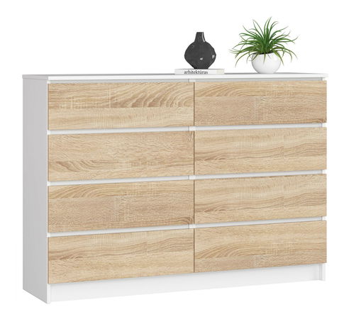 ZobrazitKomody jsou nábytek, který se v poslední době nejčastěji používá v místnostech různých typů – obývacího pokoje, ložnice, kanceláře či jídelny. Komoda Keanu III, kterou Vám s radostí představujeme, je nábytkový díl s 8 prostornými šuplíky, vyrobený z kvalitního materiálu, jakým je laminovaná deska o tloušťce 16 mm. Zásuvky se pohybují na kovových válečkových vodítkách a hrany nábytku jsou pokryty ABS lemováním, které poskytují dobrou ochranu před poškozením. Zajímavá komoda v nadčasových barvách si jistě najde oblibu u náročných zákazníků, které pozitivně překvapí atraktivní cena a mimořádná funkčnost.