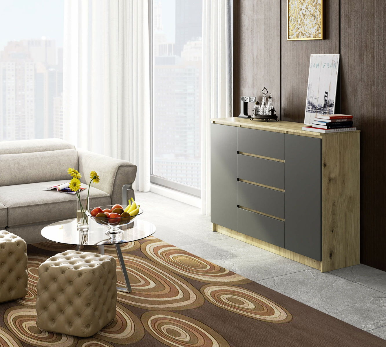 ZobrazitKomody jsou nábytek, který se v poslední době nejčastěji používá v místnostech různých typů – obývacího pokoje, ložnice, kanceláře či jídelny. Komoda Keanu IV, kterou Vám s radostí představujeme, je nábytkový díl se 4 prostornými zásuvkami a 2 dvířky, vyrobený z kvalitního materiálu, jakým je laminovaná deska o tloušťce 16 mm. Zásuvky se pohybují na kovových válečkových vodítkách a hrany nábytku jsou pokryty ABS lemováním, které poskytují dobrou ochranu před poškozením. Zajímavá komoda v nadčasových barvách si jistě najde oblibu u náročných zákazníků, které pozitivně překvapí atraktivní cena a mimořádná funkčnost.