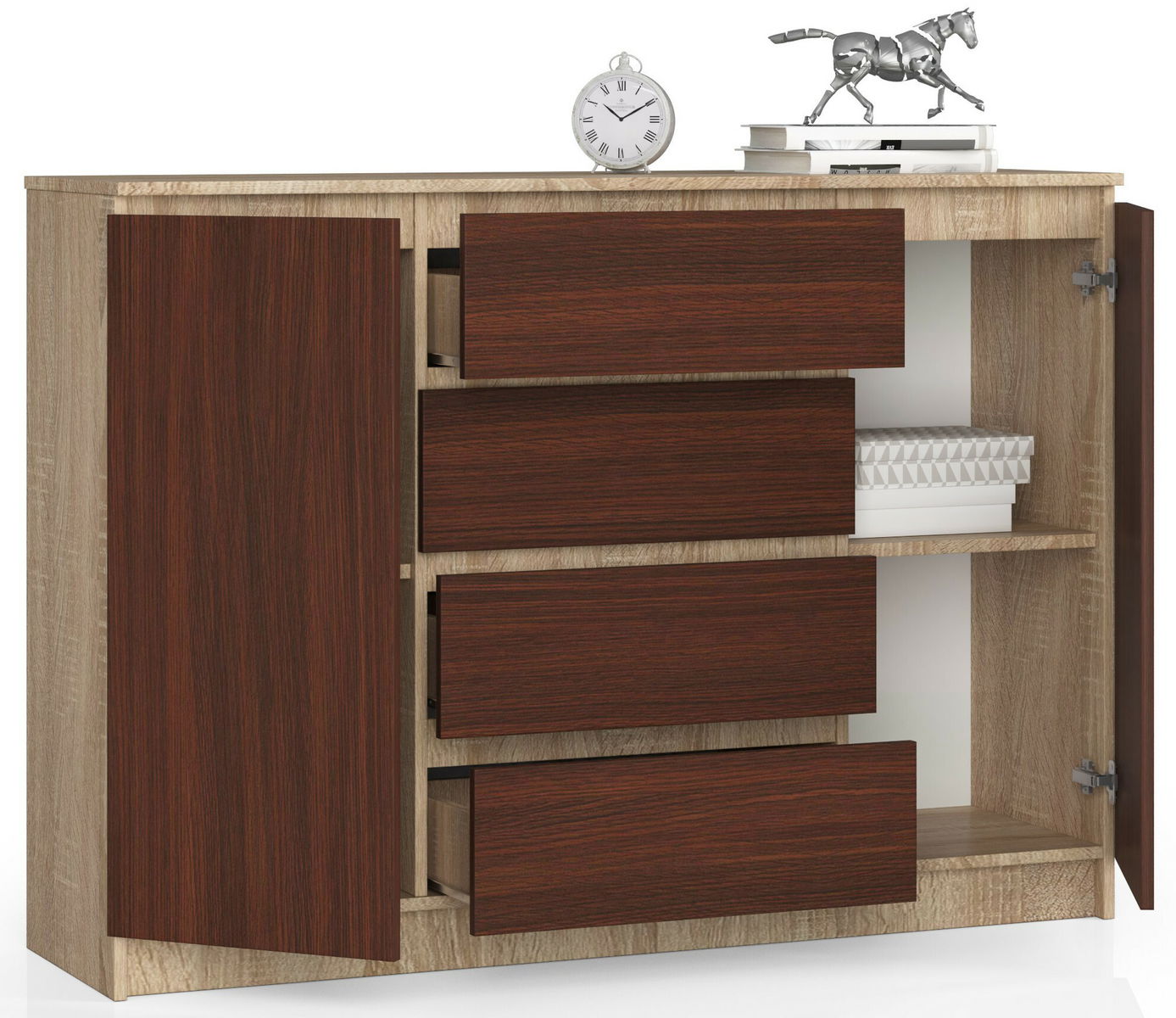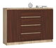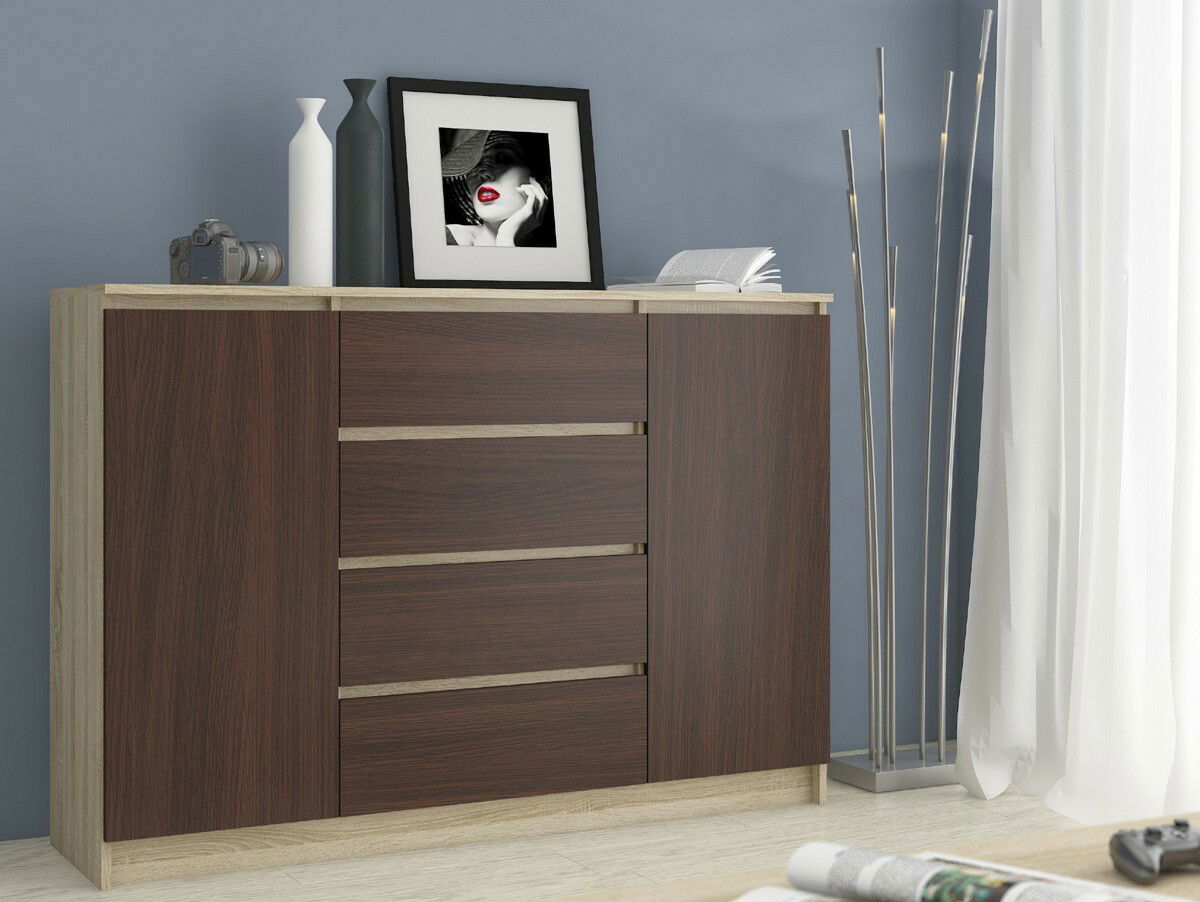 ZobrazitKomody jsou nábytek, který se v poslední době nejčastěji používá v místnostech různých typů – obývacího pokoje, ložnice, kanceláře či jídelny. Komoda Keanu IV, kterou Vám s radostí představujeme, je nábytkový díl se 4 prostornými zásuvkami a 2 dvířky, vyrobený z kvalitního materiálu, jakým je laminovaná deska o tloušťce 16 mm. Zásuvky se pohybují na kovových válečkových vodítkách a hrany nábytku jsou pokryty ABS lemováním, které poskytují dobrou ochranu před poškozením. Zajímavá komoda v nadčasových barvách si jistě najde oblibu u náročných zákazníků, které pozitivně překvapí atraktivní cena a mimořádná funkčnost.
