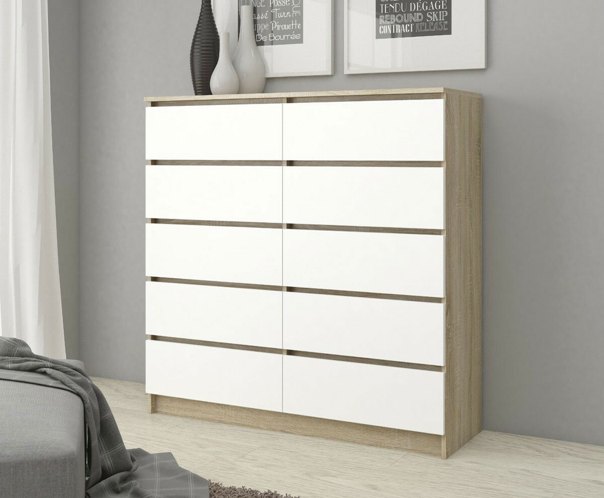 Komody jsou nábytek, který se v poslední době nejčastěji používá v místnostech různých typů – obývacího pokoje, ložnice, kanceláře či jídelny. Komoda Keanu V, kterou Vám s radostí představujeme, je nábytkový díl až s 10 prostornými šuplíky, vyrobený z kvalitního materiálu, jakým je laminovaná deska o tloušťce 16 mm. Zásuvky se pohybují na kovových válečkových vodítkách a hrany nábytku jsou pokryty ABS lemováním, které poskytují dobrou ochranu před poškozením. Zajímavá komoda v nadčasových barvách si jistě najde oblibu u náročných zákazníků, které pozitivně překvapí atraktivní cena a mimořádná funkčnost.