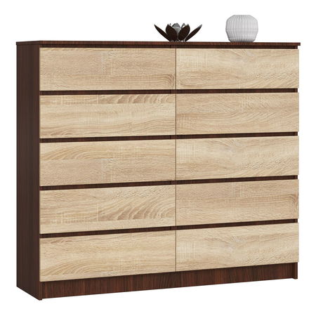 Komody jsou nábytek, který se v poslední době nejčastěji používá v místnostech různých typů – obývacího pokoje, ložnice, kanceláře či jídelny. Komoda Keanu V, kterou Vám s radostí představujeme, je nábytkový díl až s 10 prostornými šuplíky, vyrobený z kvalitního materiálu, jakým je laminovaná deska o tloušťce 16 mm. Zásuvky se pohybují na kovových válečkových vodítkách a hrany nábytku jsou pokryty ABS lemováním, které poskytují dobrou ochranu před poškozením. Zajímavá komoda v nadčasových barvách si jistě najde oblibu u náročných zákazníků, které pozitivně překvapí atraktivní cena a mimořádná funkčnost.