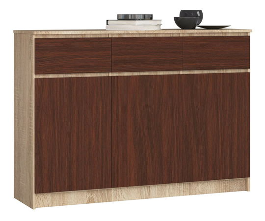 Komody jsou nábytek, který se v poslední době nejčastěji používá v místnostech různých typů – obývacího pokoje, ložnice, kanceláře či jídelny. Komoda Keanu VI, kterou Vám s radostí představujeme, je nábytkový díl se 3 prostornými zásuvkami a 3 dvířky, vyrobený z kvalitního materiálu, jakým je laminovaná deska o tloušťce 16 mm. Zásuvky se pohybují na kovových válečkových vodítkách a hrany nábytku jsou pokryty ABS lemováním, které poskytují dobrou ochranu před poškozením. Zajímavá komoda v nadčasových barvách si jistě najde oblibu u náročných zákazníků, které pozitivně překvapí atraktivní cena a mimořádná funkčnost.