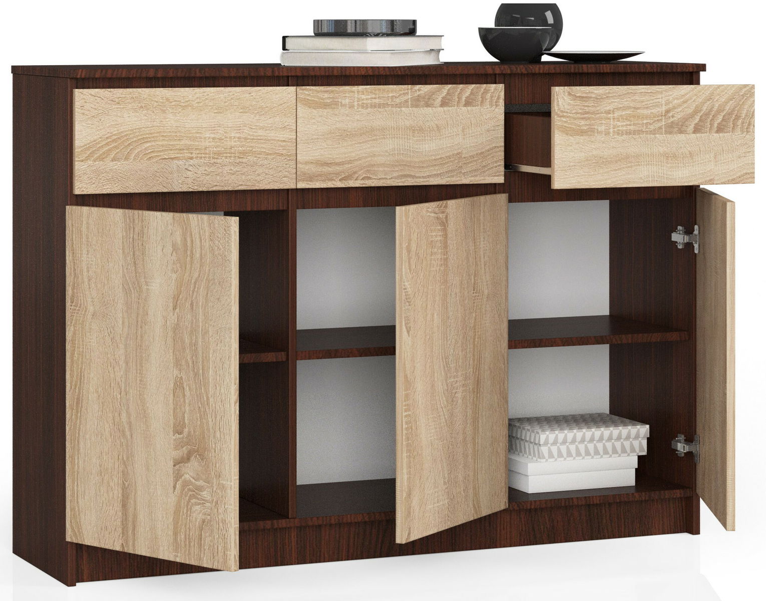 ZobrazitKomody jsou nábytek, který se v poslední době nejčastěji používá v místnostech různých typů – obývacího pokoje, ložnice, kanceláře či jídelny. Komoda Keanu VI, kterou Vám s radostí představujeme, je nábytkový díl se 3 prostornými zásuvkami a 3 dvířky, vyrobený z kvalitního materiálu, jakým je laminovaná deska o tloušťce 16 mm. Zásuvky se pohybují na kovových válečkových vodítkách a hrany nábytku jsou pokryty ABS lemováním, které poskytují dobrou ochranu před poškozením. Zajímavá komoda v nadčasových barvách si jistě najde oblibu u náročných zákazníků, které pozitivně překvapí atraktivní cena a mimořádná funkčnost.