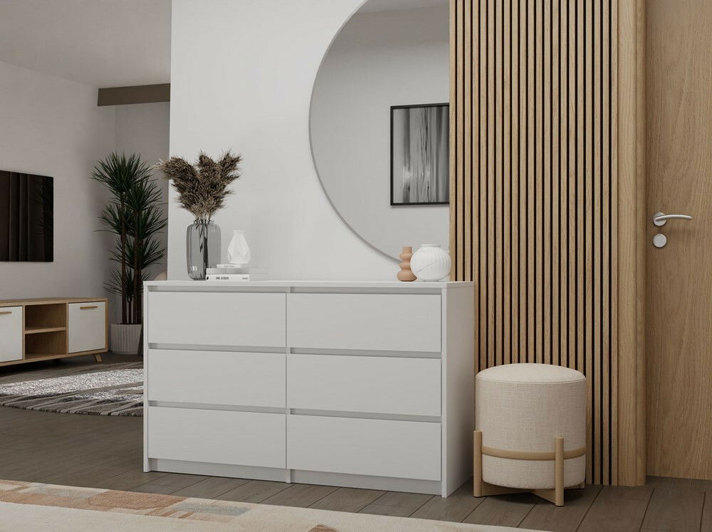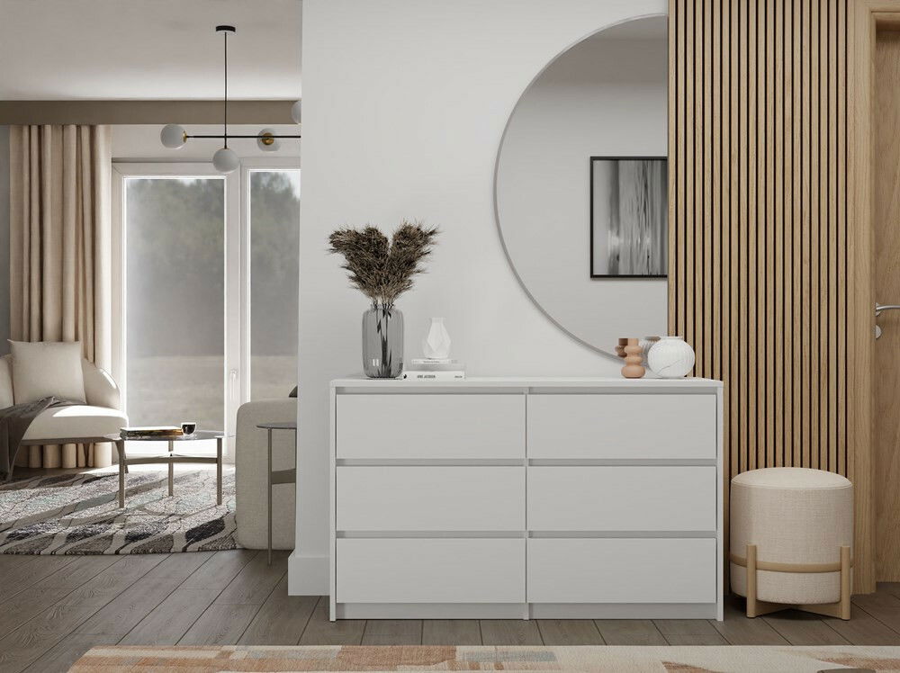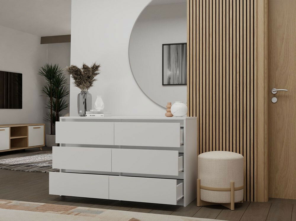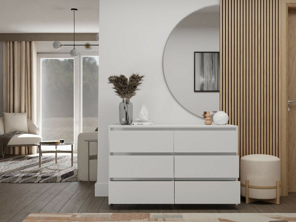 ZobrazitKomoda Kentero 3 v elegantní bílé barvě je ideálním řešením pro každou moderní domácnost. S šesti prostornými zásuvkami nabízí dostatek úložného prostoru, přičemž minimalistický design bezúchytkových front dodává interiéru sofistikovaný vzhled. Vyrobená z kvalitní laminované dřevotřísky, komoda je odolná a snadno se udržuje. Její robustní konstrukce a hladké boky zaručují dlouhou životnost, zatímco praktické válečkové vedení šuplíků zajišťuje pohodlné a bezpečné používání. Tento kus nábytku skvěle doplní vaši ložnici, obývací pokoj nebo dětský pokoj.