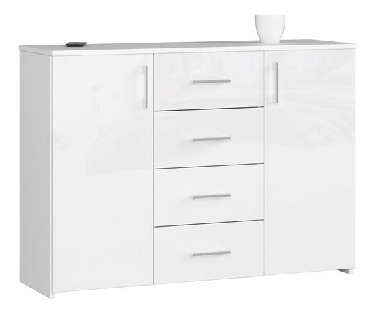 Komoda Kiran, kterou Vám s radostí představujeme, je nábytkový díl se 4 prostornými šuplíky a 2 dvířky, vyrobený z kvalitního materiálu, jakým je laminovaná deska o tloušťce 16 mm. Zásuvky se pohybují na kovových válečkových vodítkách a hrany nábytku jsou pokryty ABS lemováním, které poskytují dobrou ochranu před poškozením. Úchytky komody Kiran jsou stříbrné barvy. Zajímavá komoda v nadčasových barvách si jistě najde oblibu u všech zákazníků, které pozitivně překvapí atraktivní cena a mimořádná funkčnost.