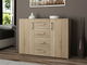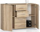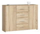 Komoda Kiran, kterou Vám s radostí představujeme, je nábytkový díl se 4 prostornými šuplíky a 2 dvířky, vyrobený z kvalitního materiálu, jakým je laminovaná deska o tloušťce 16 mm. Zásuvky se pohybují na kovových válečkových vodítkách a hrany nábytku jsou pokryty ABS lemováním, které poskytují dobrou ochranu před poškozením. Úchytky komody Kiran jsou stříbrné barvy. Zajímavá komoda v nadčasových barvách si jistě najde oblibu u všech zákazníků, které pozitivně překvapí atraktivní cena a mimořádná funkčnost.