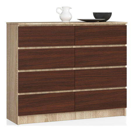 Velmi prostorná komoda Kohen v nadčasovém provedení je zajímavou nabídkou, kterou lze s úspěchem využít v kancelářských, ale i bytových prostorách, jako jsou ložnice, obývací pokoje nebo haly. Nábytek je vyroben z kvalitní laminované desky o tloušťce 16 mm. Tento materiál je vysoce odolný vůči poškození, díky čemuž je komoda atraktivní i po delší době používání. Moderní komody se vyznačují jednoduchostí a elegancí. Díky komodě Kohen bude možné v dané místnosti uložit spoustu potřebných věcí. Nábytek se skládá ze 6 prostorných zásuvek, které se pohybují na kovových válečkových vodítkách. Hrany pokryté ABS lemováním zajišťují vysokou ochranu proti poškození. Dostupná ve více barevných provedeních.