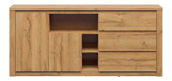 Objevte velkorysou komodu KOM2D3S z kolekce Walton. Nabízí vám 3 prostorné zásuvky, 3 otevřené police a prostornou skříňku s dvířky. Tiché a hladké zavírání zajišťuje pohodlné a elegantní používání. Dodávána v demontu.