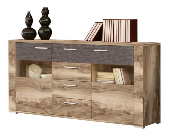 Stylová třídílná komoda Koror, která je předurčena k obývací stěně Koror. Ve středu jsou 4 zásuvky a horní zásuvka je v odstínu dub denver. Po stranách se nacházejí dvířka částečně v odstínu dub denver, pak ořech satinové a sklo.