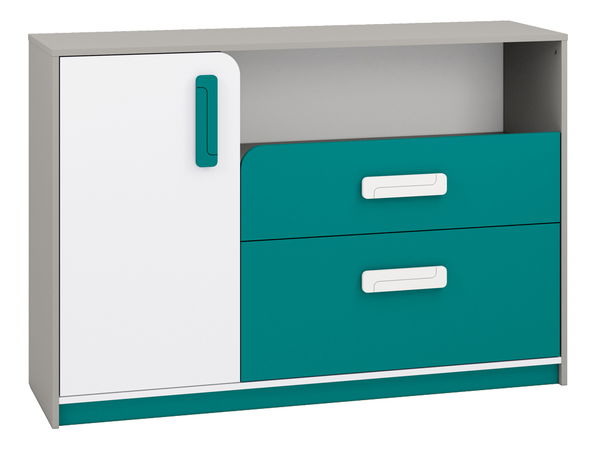 Komoda je rozdělena na dvě části. Levá strana je uzavřena a má dvě police. Pravá strana má vrchní část otevřenou, kde se nachází jedna police a pod ní dvě zásuvky.