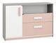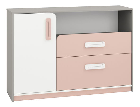 Komoda je rozdělena na dvě části. Levá strana je uzavřena a má dvě police. Pravá strana má vrchní část otevřenou, kde se nachází jedna police a pod ní dvě zásuvky.