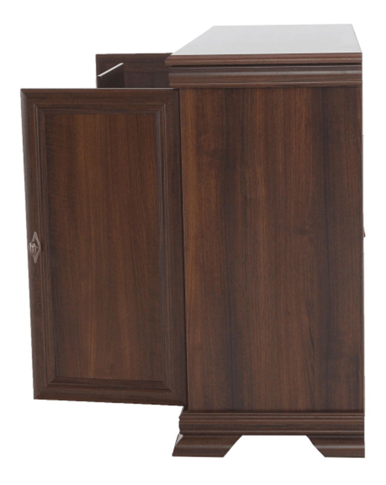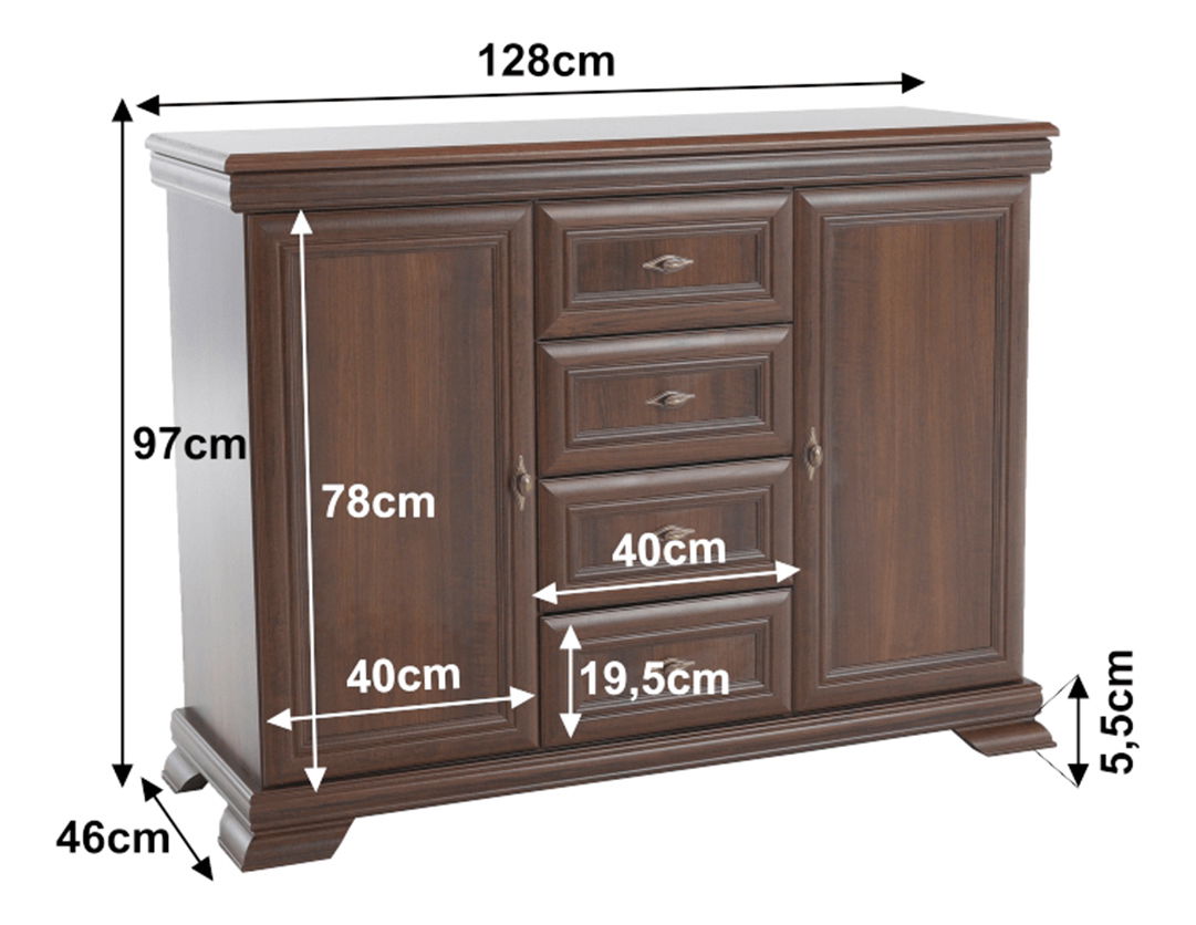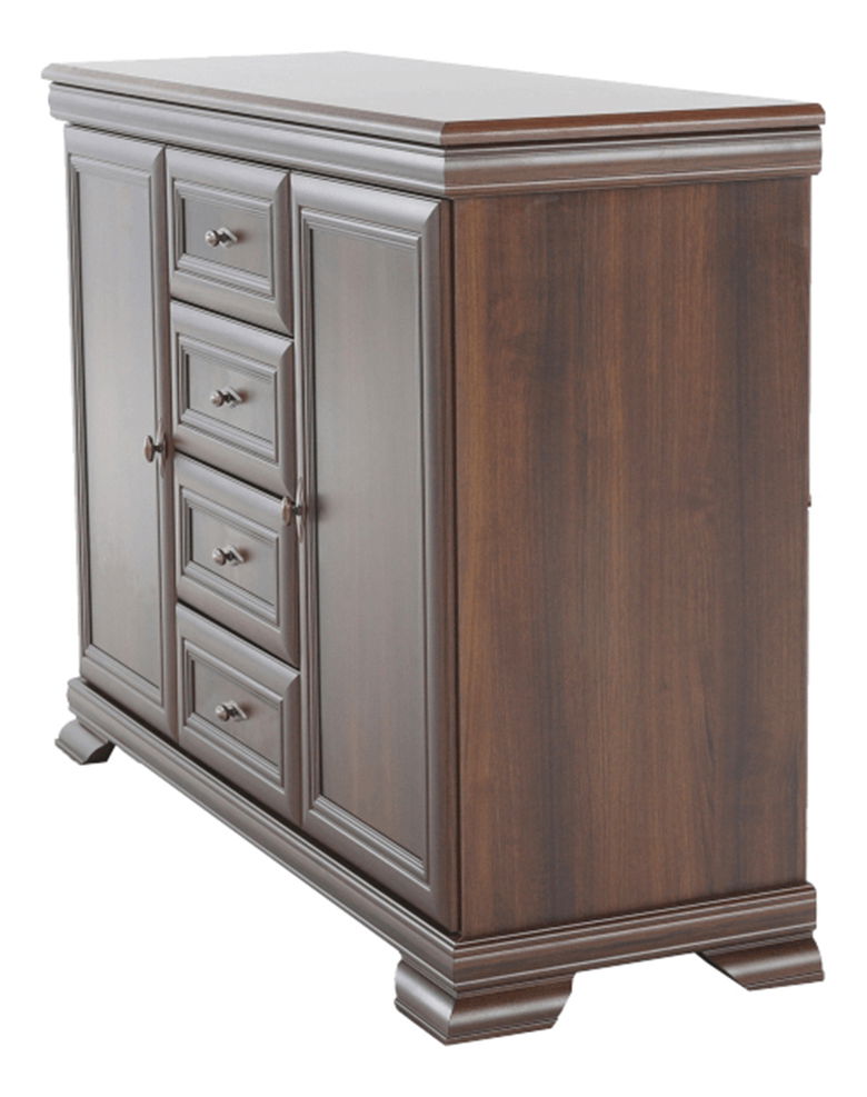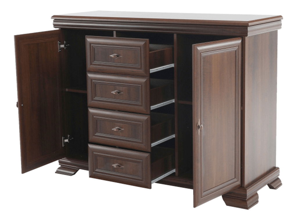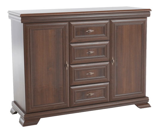 Masivní a elegantní komoda Kraz rustikálního stylu, která má čtyři zásuvky a dvoje dvířka. Vyřezávané ozdobné nohy, lišty a tmavé provedení Samoa king se zalíbí těm, kteří milují tradice a touží po eleganci v domácnostech.