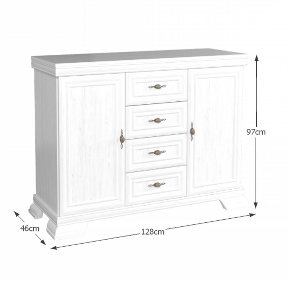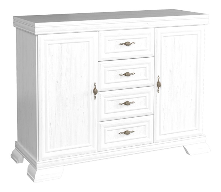 Masivní a elegantní komoda Kraz rustikálního stylu, která má čtyři zásuvky a dvoje dvířka. Vyřezávané ozdobné nohy, lišty a provedení sosna andersen se zalíbí těm, kteří milují tradice a touží po eleganci v domácnostech.