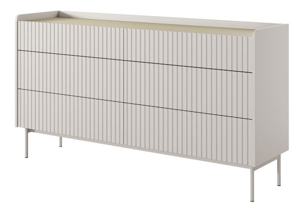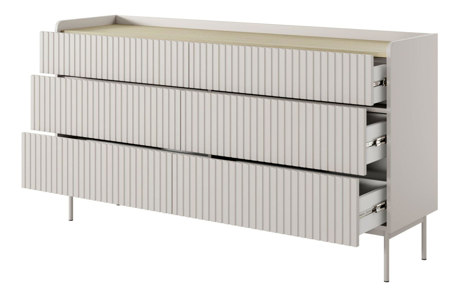 ZobrazitKomoda Lemenn III (béžová) nabízí moderní design a praktické funkce. Je vyrobena z laminované dřevotřísky, s MDF tloušťkou 16 mm po stranách a 18 mm na přední části, což zaručuje její pevnost a odolnost. Otevírání probíhá bez úchytek, pomocí systému stlačení, což dodává komodě čistý a minimalistický vzhled. Kovové nožičky v béžové barvě poskytují stabilitu a styl. Tato komoda je ideálním řešením pro moderní interiér.