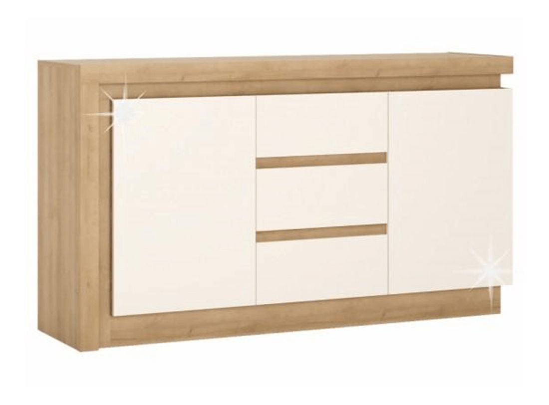 Nádherná komoda v moderním designu, která bude rozhodně stylovým prvkem ve Vaší obývacím pokoji. Komoda má po obvodu efektní LED osvětlení a má dvoje dvířka a tři zásuvky. Použité materiály jsou odolné vůči poškrábání a vlhkosti. Komoda má dotykové otevírání a zavírání soft closing. Barevné provedení komody je dub riviera a extra vysoký lesk bílý.