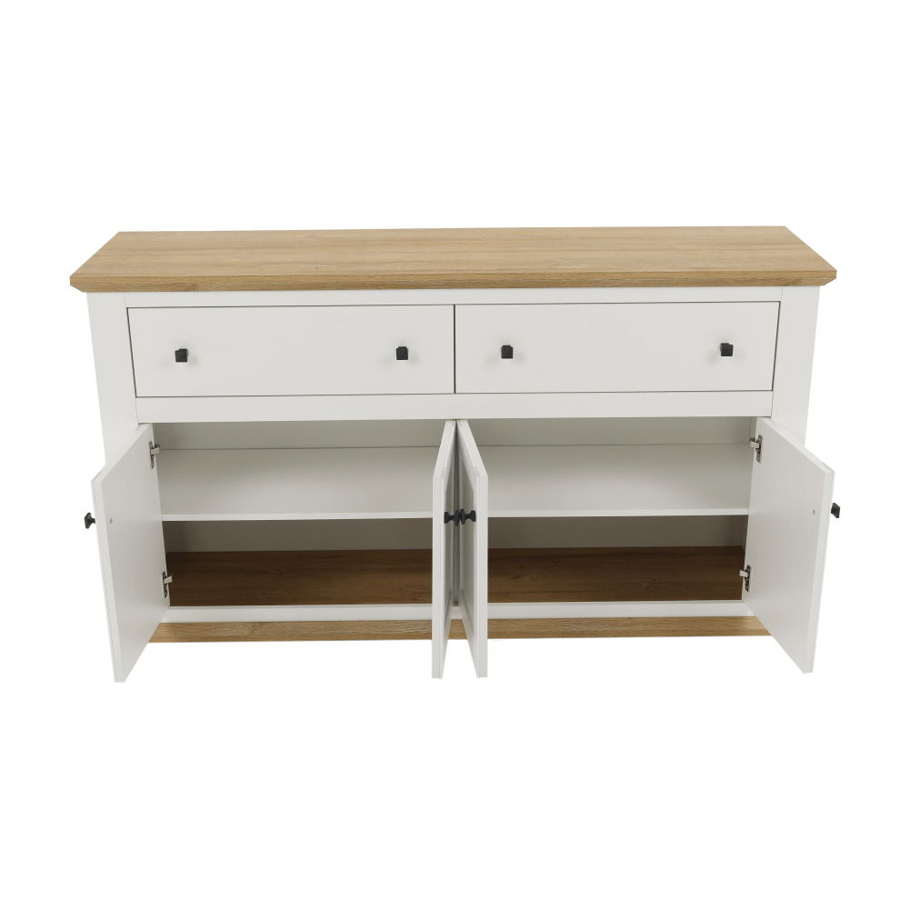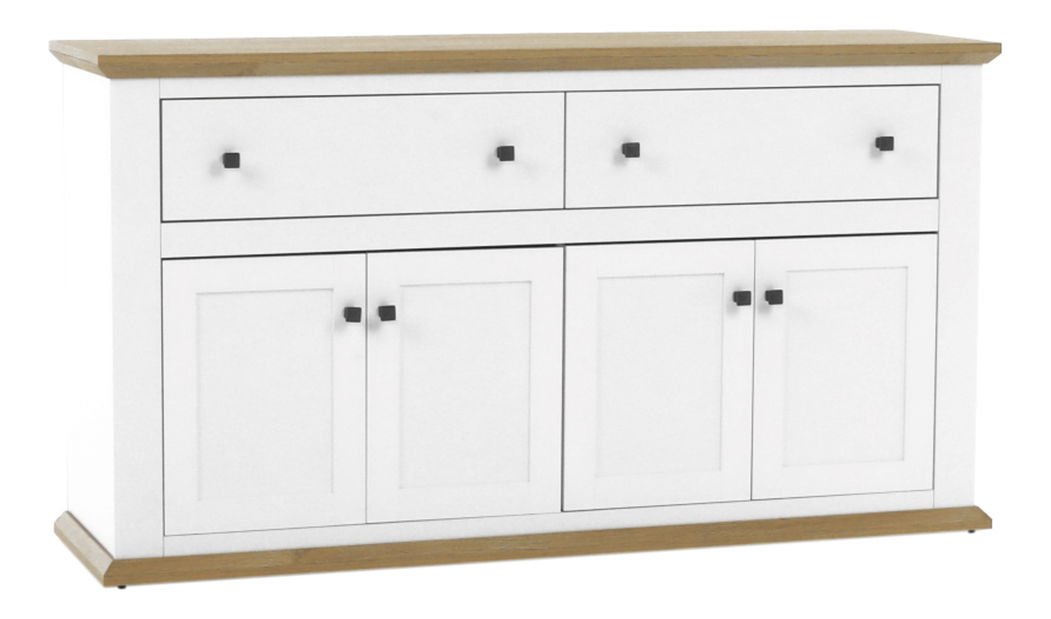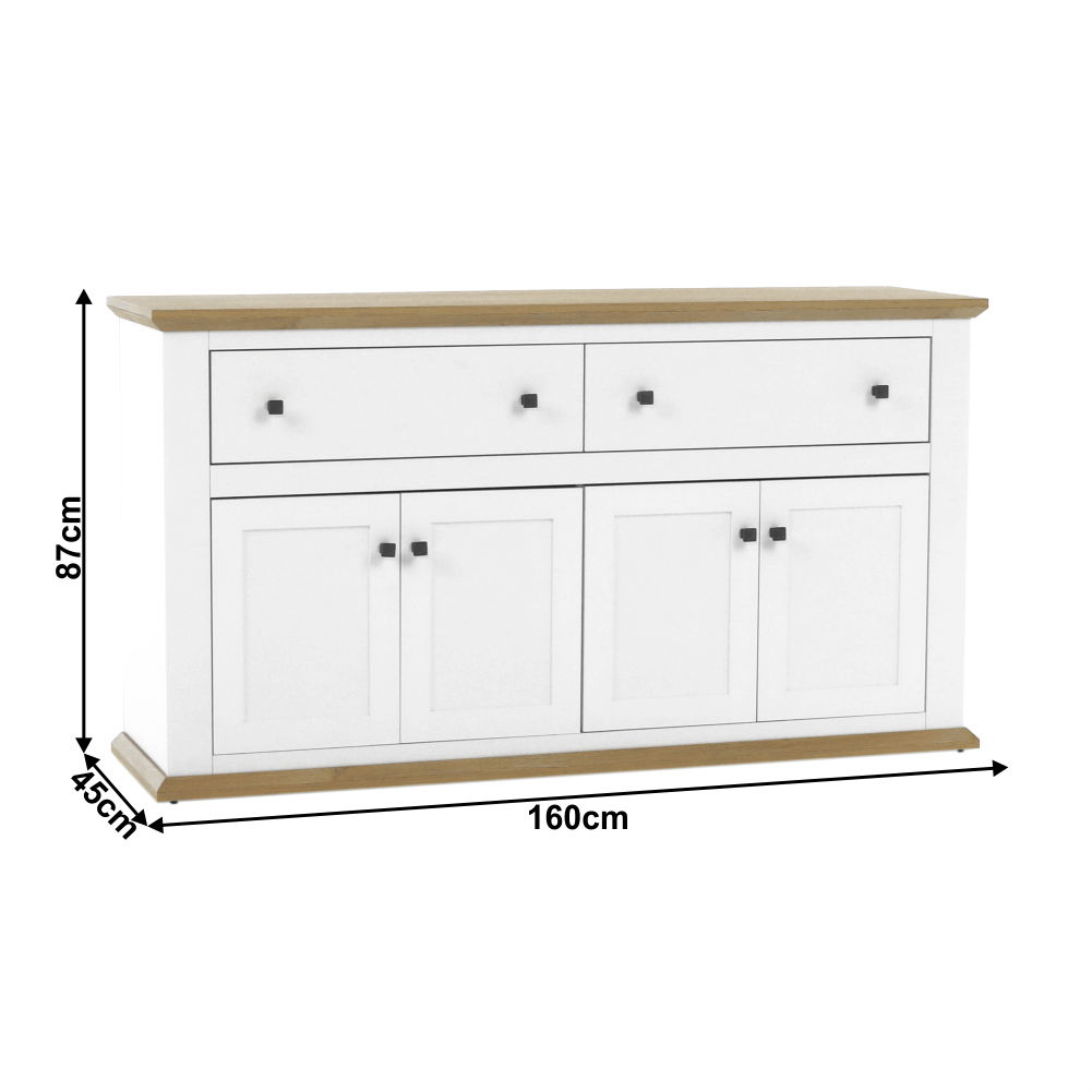 Komoda Leoras MZ10 je elegantní a moderní nábytková skříňka, která vám poskytne dostatek úložného prostoru a zároveň zkrášlí váš interiér. Skříňka je vyrobena z kvalitního materiálu DTD laminovaná/ABS hrany a je bílo-dubového grand barvení. Její rozměry jsou 160x45x87 cm a tloušťka materiálu je 40 mm. Kromě čtyř skříněk, skříňka má také zásuvky se zásuvkami, kovové úchytky a 3D efekt. Skříňka je dodávána v demontu a její montáž je jednoduchá. S touto nábytkovou skříňkou získáte nejen praktický úložný prostor, ale také moderní a elegantní doplněk vašeho domova.